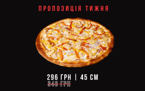 (соус,помідор,сир Моцарела, куряче філе,ананас,шинка,болгарський перець,кукурудза)
