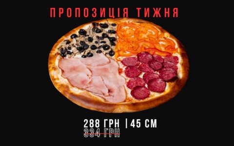 (шинка, помідор, болгарський перець, печериці, маслини, салямі, соус, сир Моцарелла)