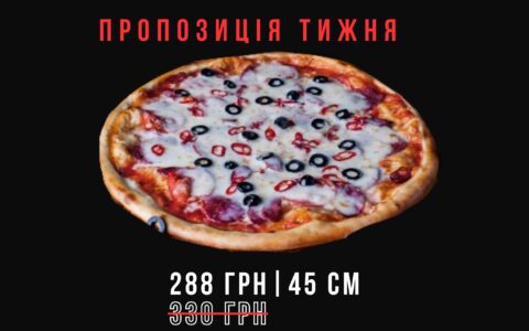 (соус,помідор,сир Моцарела,салямі,ковбаски мисливські, перець чилі,маслини)
