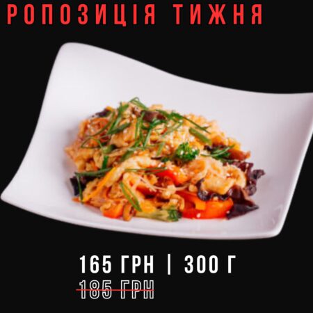 Локшина харусаме, куряче філе, кислосолодкий соус, яйце куряче, соєвий соус, імбирний соус, олія соняшникова та кунжутна, соус шрірача, перець болгарський, морква, брокколі, стручкова квасоля, гриби шитакі, гриби муер, кунжут, цибуля зелена.