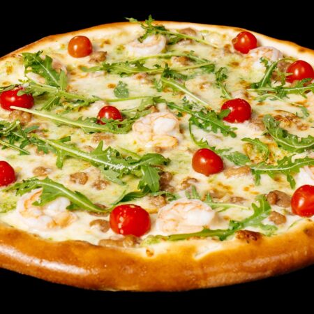 Соус шпинатний,креветки,креветки королівські,помідори Черрі, рукола,пармезан.